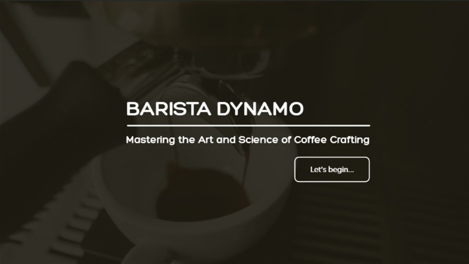 An interactive coffee training program developed in Articulate Storyline 360 that teaches barista skills including espresso preparation, equipment operation, and beverage crafting techniques.